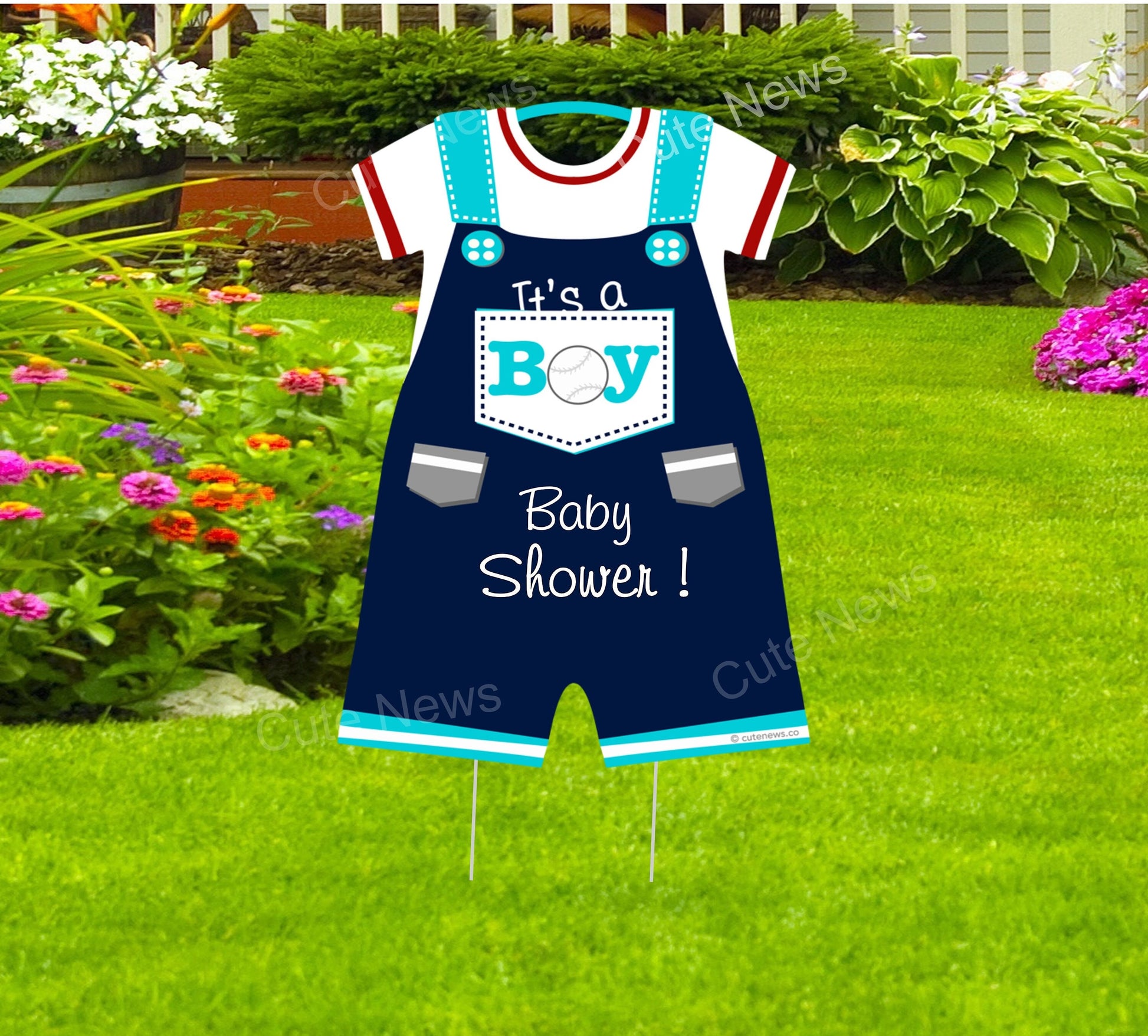 This gorgeous front yard Navy Overall Outfit Lawn Card is the perfect way to welcome your guests to your baby shower event.