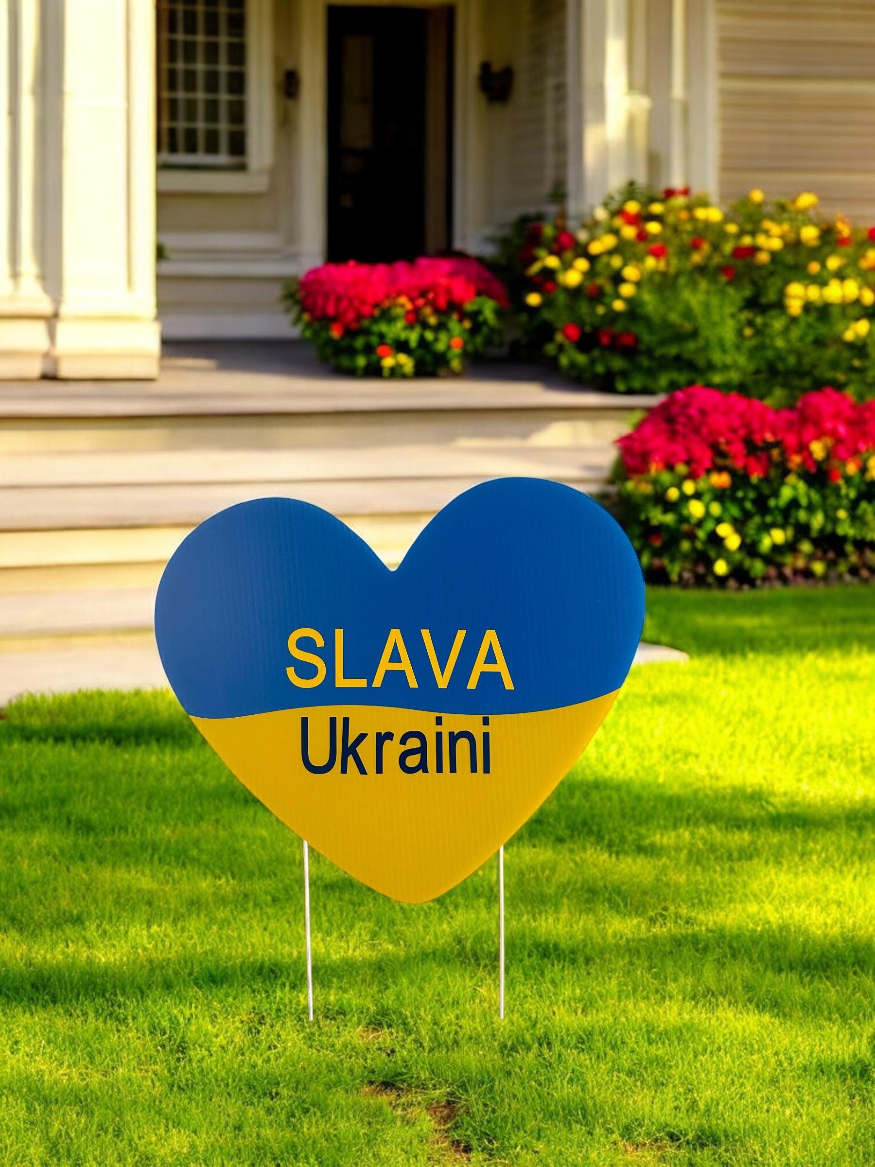 Stand with Ukraine Lawn Sign, Ukrainian Flag Outdoor Yard Decoration Card, Support Ukraine Art Heart Cutout with Stakes, Patriotic Greeting