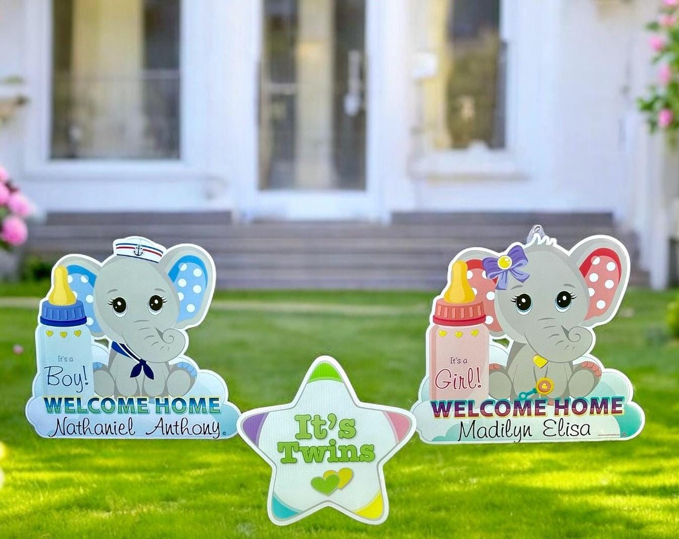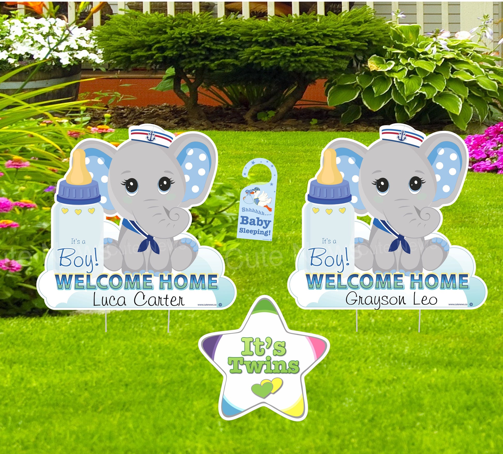 Kit Includes: Two Elephant Lawn Signs, a "It's Twins" Star Announcement, and a Shh. Baby Sleeping Door Holder